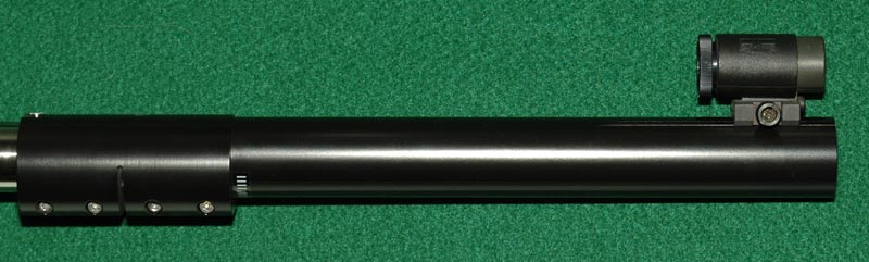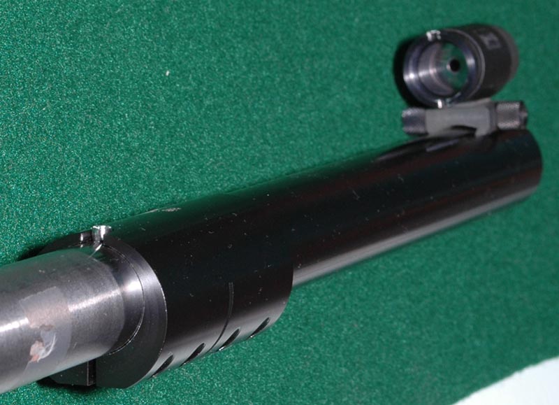 There are four clamping screws in the collar, the rear pair of screws (leftmost in the picture above) are used to clamp the extension tube to the end of the barrel. When the collar and tube are removed the crown of the barrel is readily available for cleaning (and it needs it, some ammunition may leave a residue which will corrode the crown). The front pair of screws are used in the setting up of the tube.